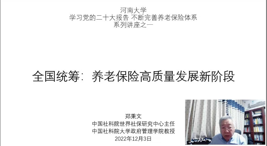 12月3日上午,应我院邀请,中国社会科学院世界社保研究中心主任郑秉文教授在线作了题为《全国统筹:养老保险高质量发展阶段》的学术报告,此次讲座由我院凌文豪教授主持,公共管理相关学科师生通过线上的方式共同参与了此次讲座。