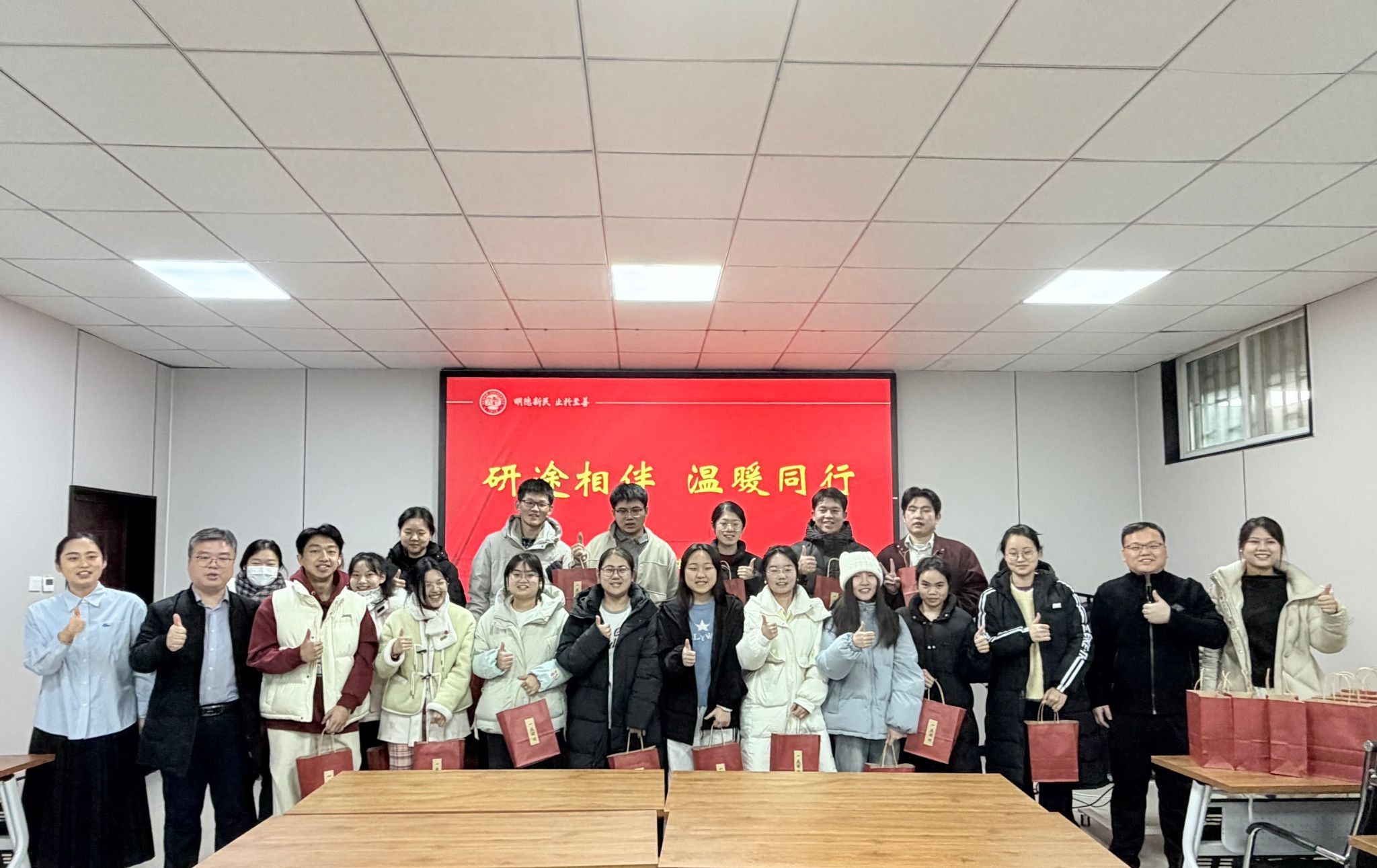 随后,参会领导和老师向考研学子送去祝福并发放“温暖礼包”,鼓励大家坚守初心,以定力、耐力、魄力迎接人生的重要考场。福袋玲珑,情谊深长:饱含甜蜜的苹果与糖果寓意“苹”安顺遂,为奋斗时光注入能量与温暖;向日葵钥匙扣寓意“一举夺魁”的,承载着对学子旗开得胜的美好祝愿。学子们接过这份心意满满的祝福,惊喜与感动溢于言表,纷纷表示将带着学院的殷切期盼,在考研征程中坚定前行。